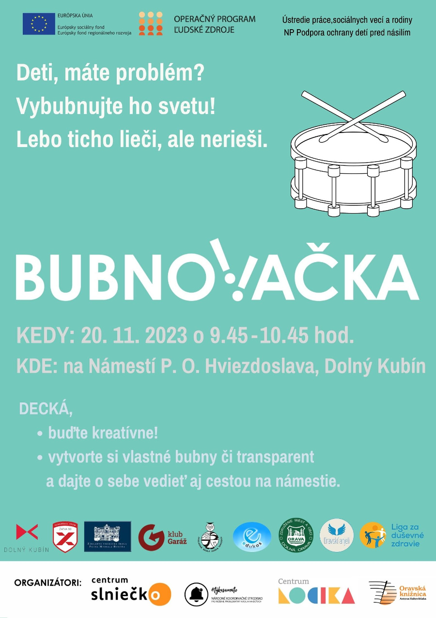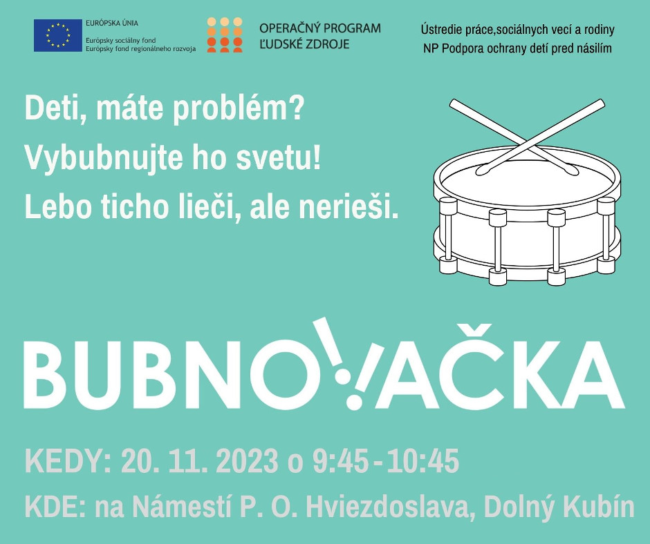 S násilím sa môžeme vysporiadať len tak, že ho nebudeme bagatelizovať, prehliadať a vnímať ako niečo, čo sa „…nás predsa netýka…“. Práve preto sa od roku 2014 vždy v novembri, organizuje podujatie “Bubnovačka – Aby bolo deti lepšie počuť!“.