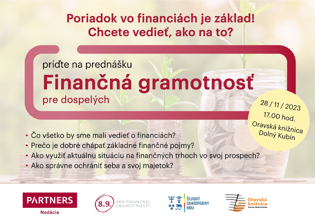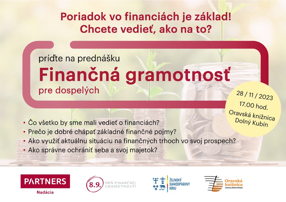 Dozviete sa, čo všetko by sme mali vedieť o financiách, prečo je dobré chápať základné finančné pojmy, ako využiť aktuálnu situáciu na finančných trhoch vo svoj prospech a ako správne ochrániť seba a svoj majetok. Tešíme sa na Vás v utorok 28. novembra 2023 o 17.00 hod. v Oravskej knižnici Antona Habovštiaka v Dolnom Kubíne.