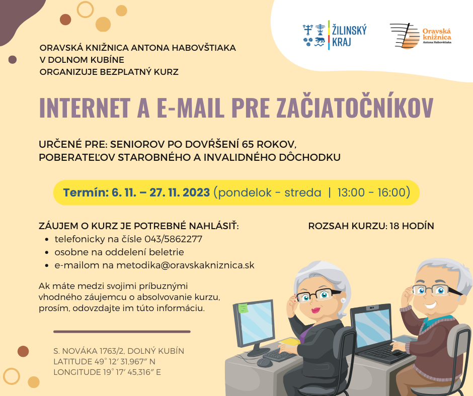 Oravská knižnica Antona Habovštiaka v Dolnom Kubíne organizuje bezplatný kurz Internet a e-mail pre začiatočníkov.