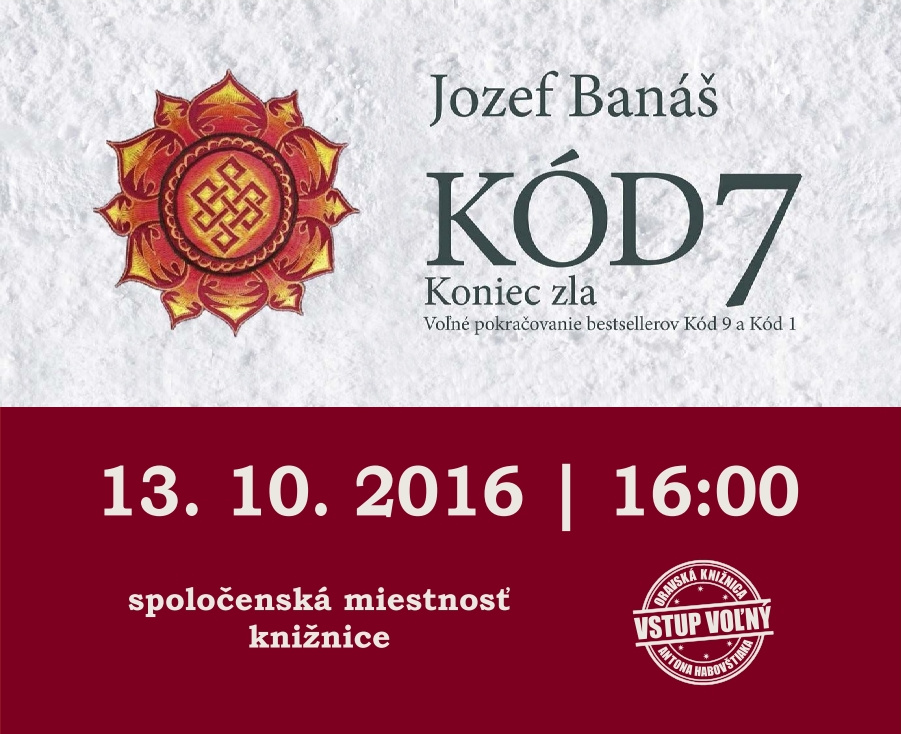 Oravská knižnica Antona Habovštiaka v Dolnom Kubíne v zriaďovateľskej pôsobnosti Žilinského samosprávneho kraja Vás srdečne pozýva na prezentáciu novej knihy Jozefa Banáša KÓD 7 – KONIEC ZLA, voľné pokračovanie bestsellerov Kód 9 a Kód 1.