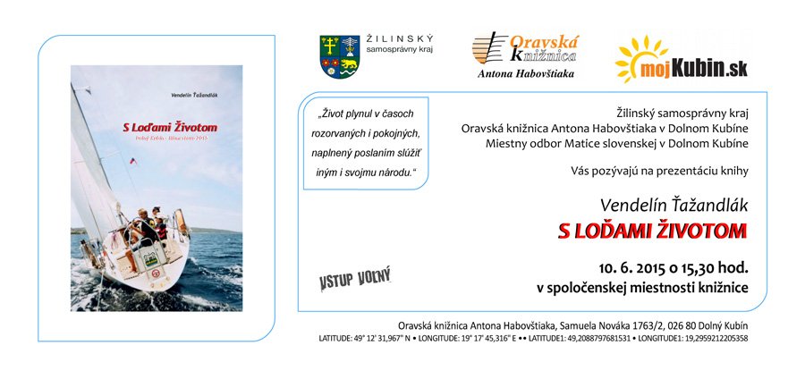 Oravská knižnica Antona Habovštiaka v zriaďovateľskej pôsobnosti Žilinského samosprávneho kraja a Miestny odbor Matice slovenskej v Dolnom Kubíne Vás pozývajú na prezentáciu knihy Vendelína Ťažandláka S LOĎAMI ŽIVOTOM. Podujatie sa uskutoční dňa 10. júna 2015 o 15,30 hod. v spoločenskej miestnosti knižnice. Vstup voľný.