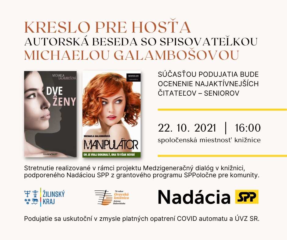 Oravská knižnica Antona Habovštiaka v Dolnom Kubíne Vás srdečne pozýva na podujatie Kreslo pre hosťa: autorská beseda so spisovateľkou Michaelou Galambošovou.